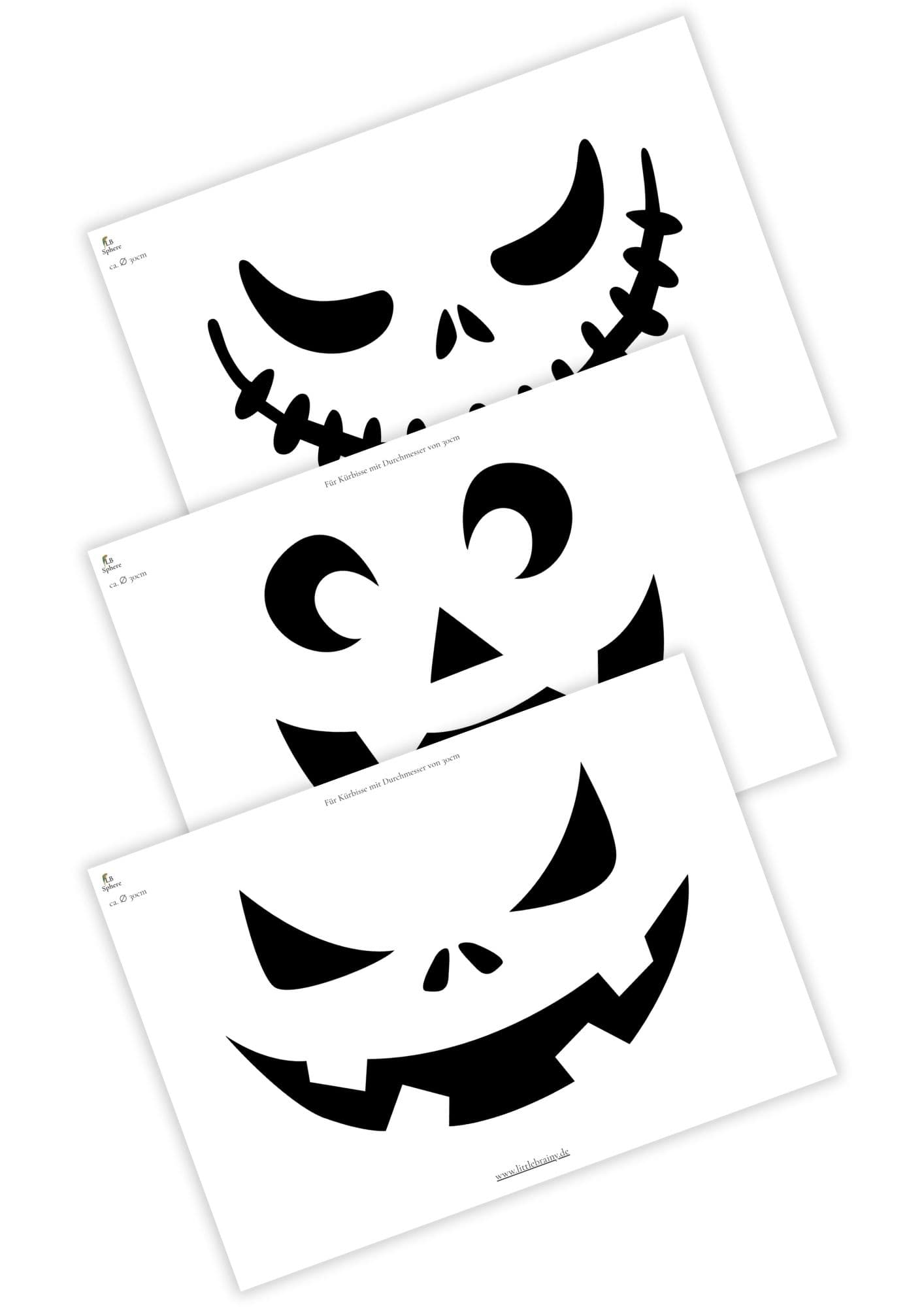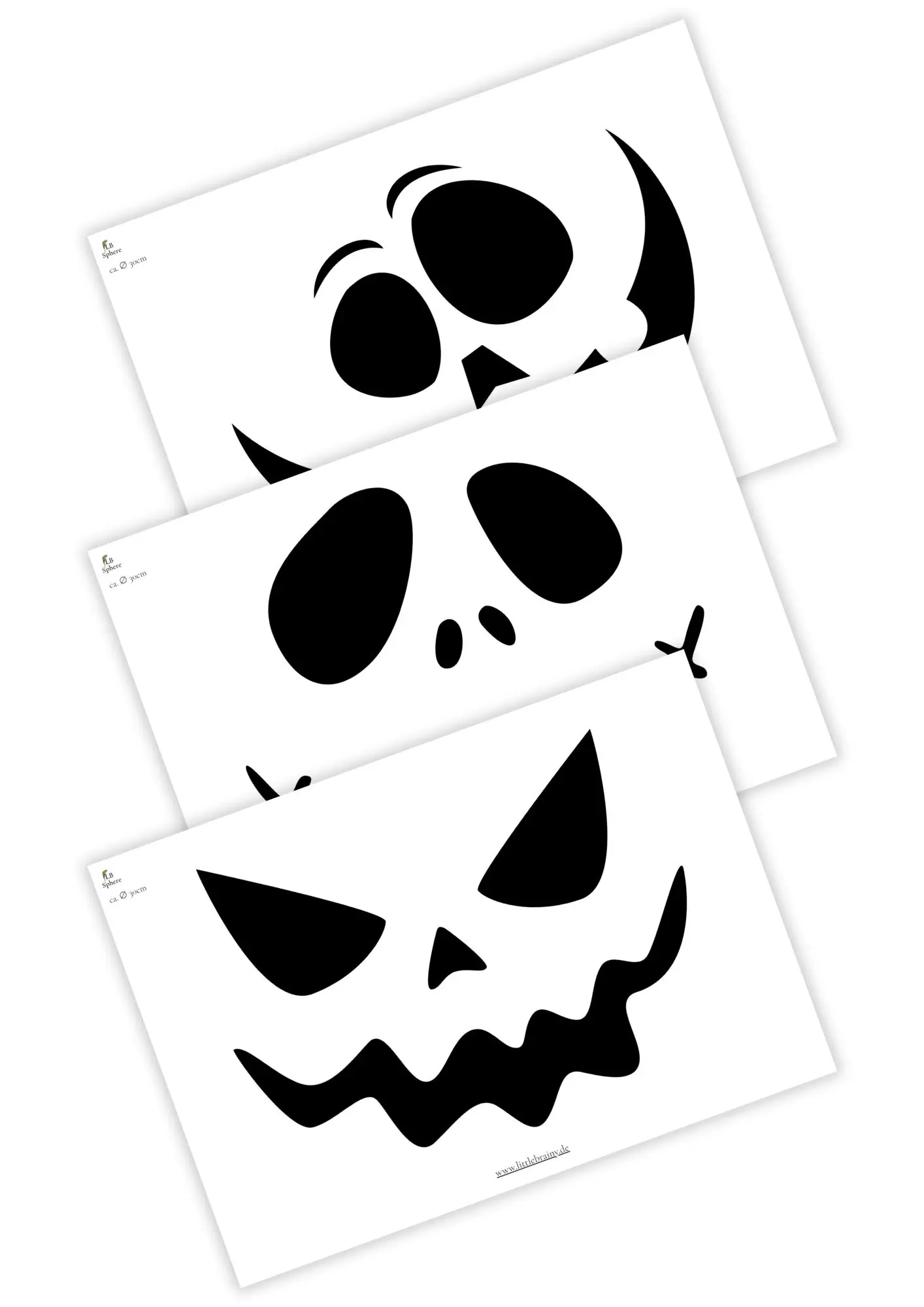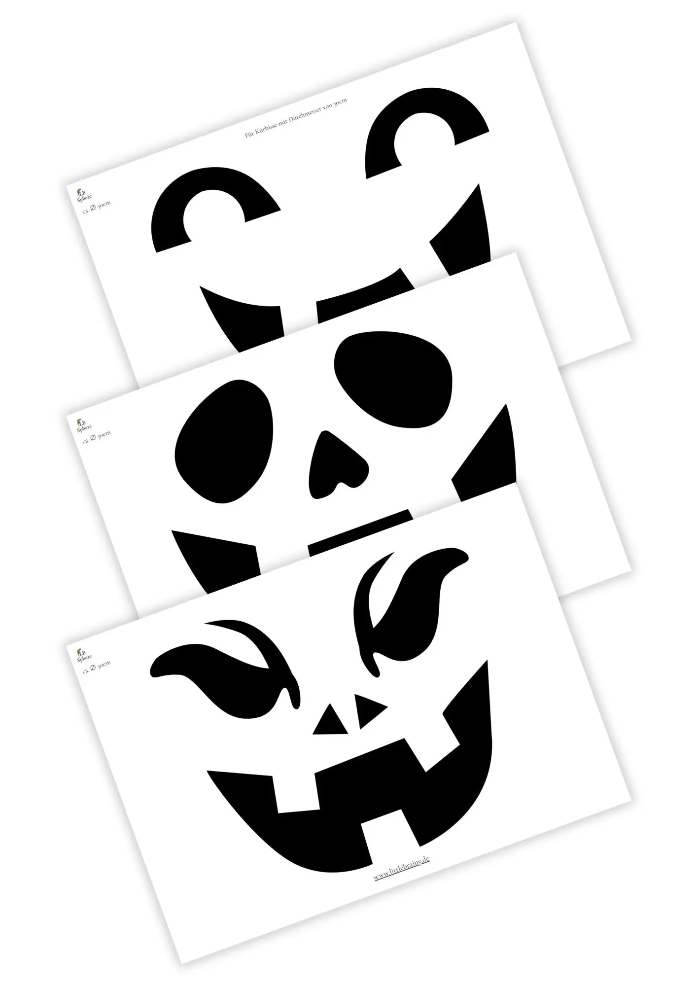 Die Gesichtsvorlagen sind in zwei Größen enthalten, sodass man beim Gestalten flexibel bleibt. Einfach das Lieblingsmotiv auswählen, ausdrucken und ausschnitzen – schon entsteht ein einzigartiges Kunstwerk. Mit einer LED-Kerze oder einem Teelicht erstrahlt der Halloween-Kürbis in mystischem Licht und verbreitet echtes Halloween-Feeling.