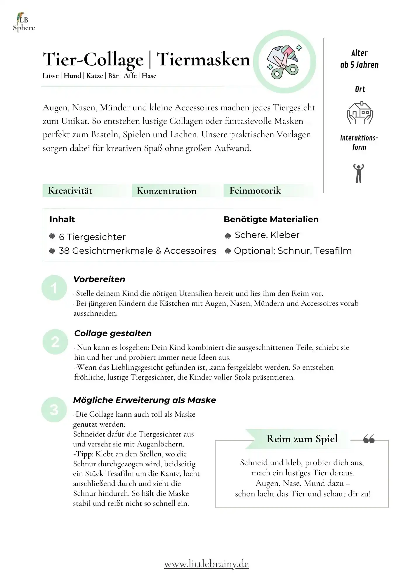 Mit diesen PDF Vorlagen werden kreative und lustige Tier Collagen gebastelt. Viele witzige Accessoires runden den Bastelspaß ab und sorgen für Lachen und Freude. Als Erweiterung können die fertigen Bilder ausgeschnitten und als bunte Masken genutzt werden.
