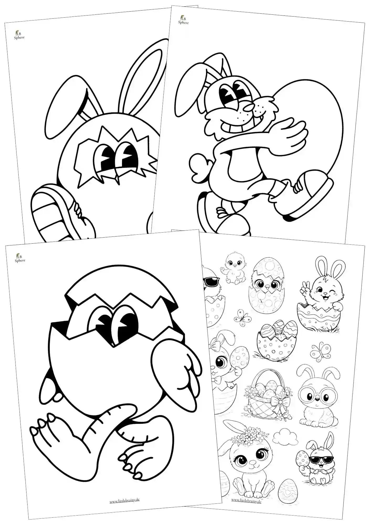 Die Sammlung enthält eine bunte Mischung aus klassischen und modernen Osterbildern. Dazu gehören Osterhasen, Ostereier, Szenen vom Eiersuchen, lustige Osterfiguren und kreative Motive rund um die Osterzeit. Dadurch bleibt das Ausmalen spannend und abwechslungsreich.
