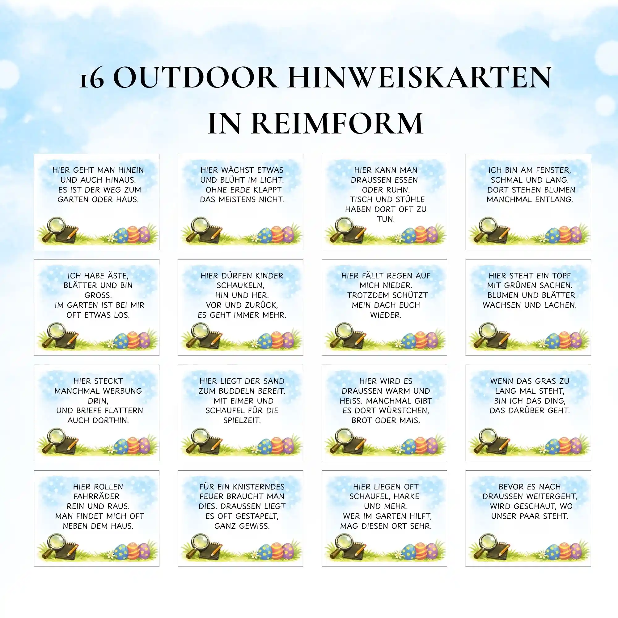 Dank der enthaltenen Blanko-Karten kannst du eigene Verstecke und Rätsel hinzufügen. So wird jede Schnitzeljagd einzigartig und genau auf deine Umgebung abgestimmt.