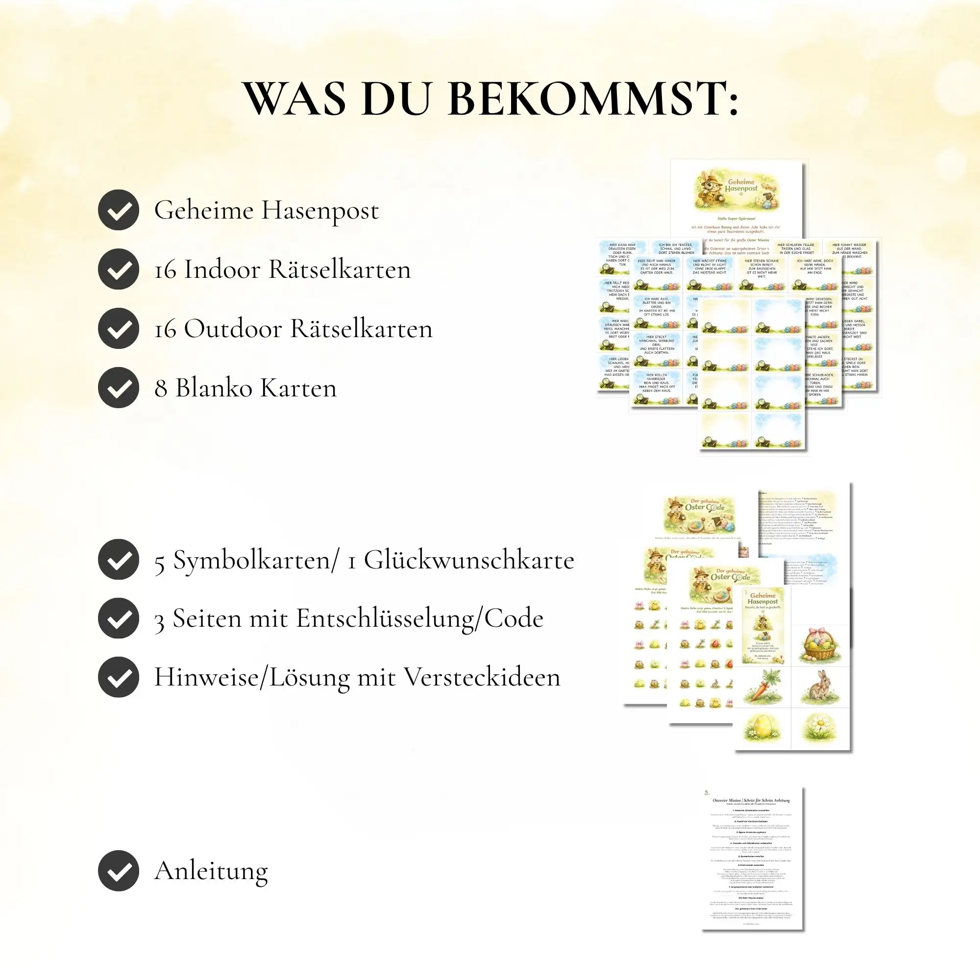Während der Schnitzeljagd sammeln die Kinder wichtige Symbole. Erst am Ende zeigt sich ihre Bedeutung: Mit Hilfe der Entschlüsselungskarte ergibt sich daraus der geheime Code, der direkt zum finalen Versteck der Osterüberraschung führt.
