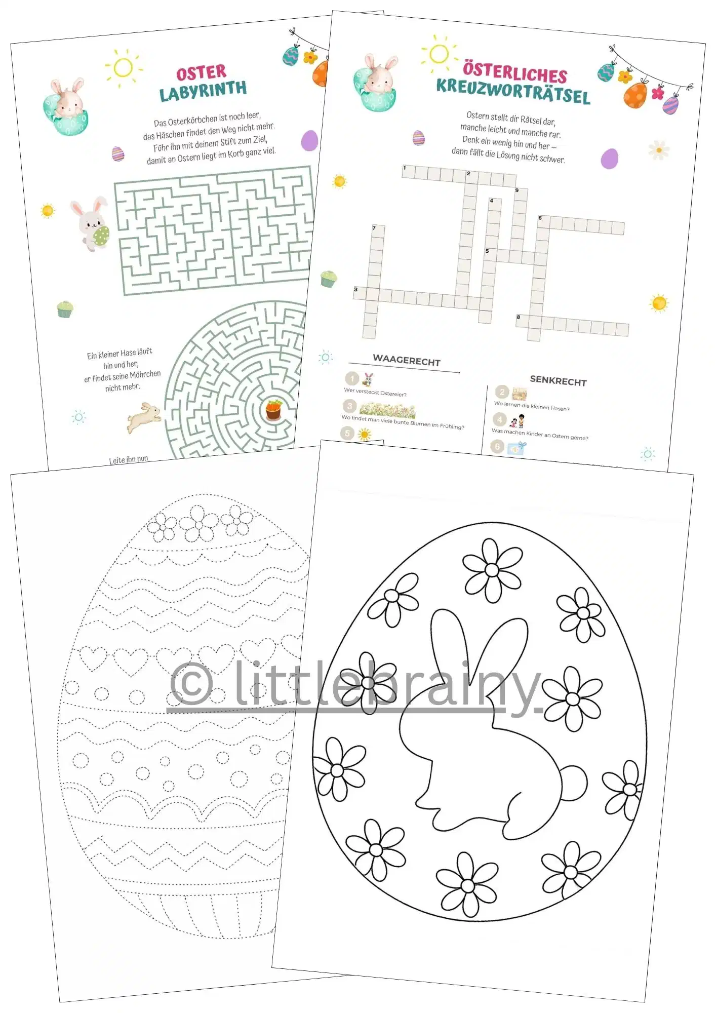 Ergänzt wird die Sammlung durch ein Oster Kreuzworträtsel, ein Osterei zum Ausmalen sowie ein gepunktetes Osterei, das nachgezeichnet und ausgemalt oder als Prickelbild verwendet werden kann. Auch ist ein Lösungsblatt enthalten, damit Kinder ihre Ergebnisse selbst überprüfen können.