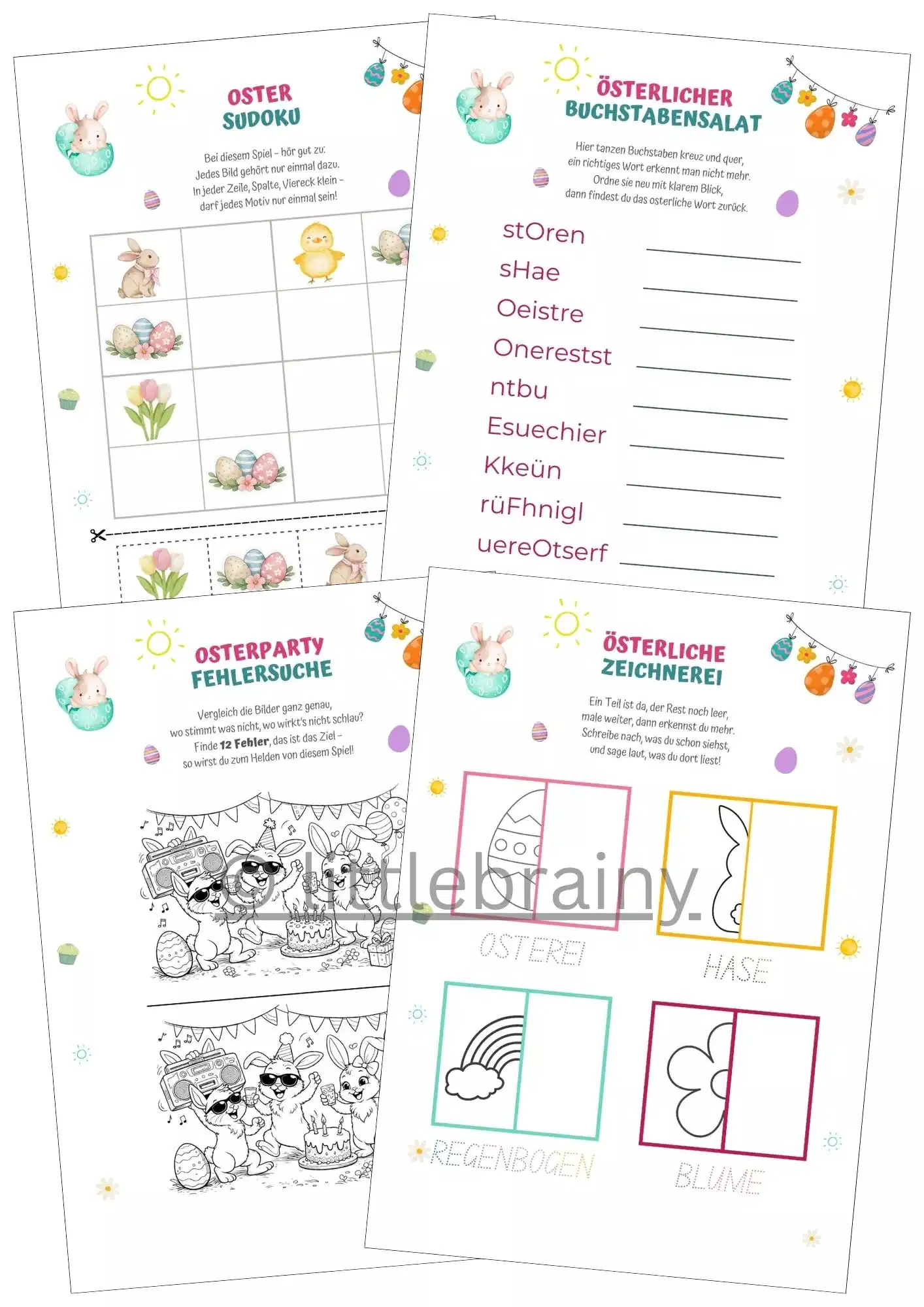Die Sammlung enthält eine große Auswahl an beliebten Rätsel und Spielideen rund um Ostern. Dazu gehören ein Oster Sudoku, ein österlicher Buchstabensalat, eine Osterparty Fehlersuche mit 12 versteckten Fehlern, eine österliche Zeichnerei zum Weiterzeichnen von vier Ostermotiven sowie eine österliche Wortsuche.