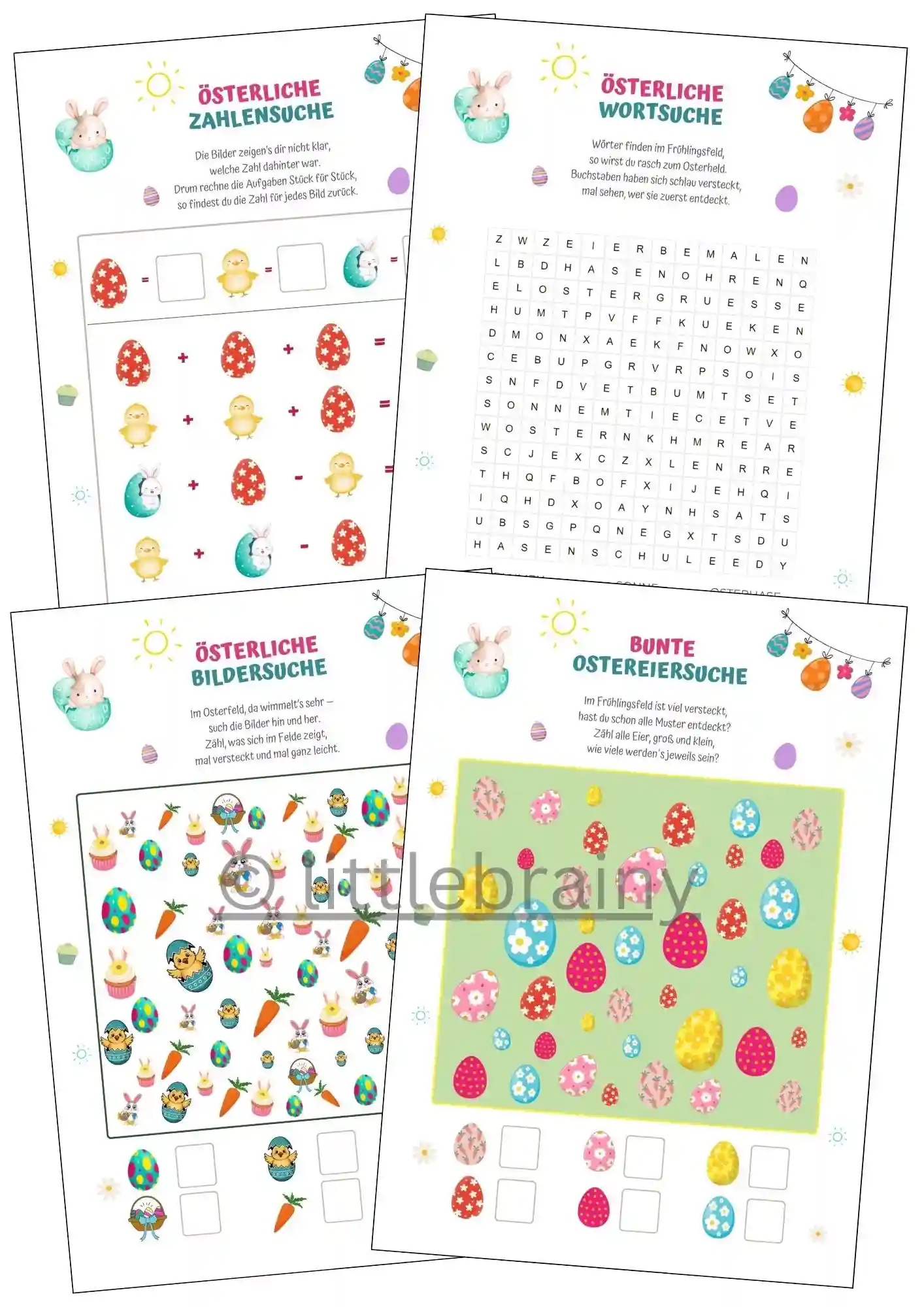 - spielerische Osterbeschäftigung mit Rätseln, Suchspielen und Malaufgaben