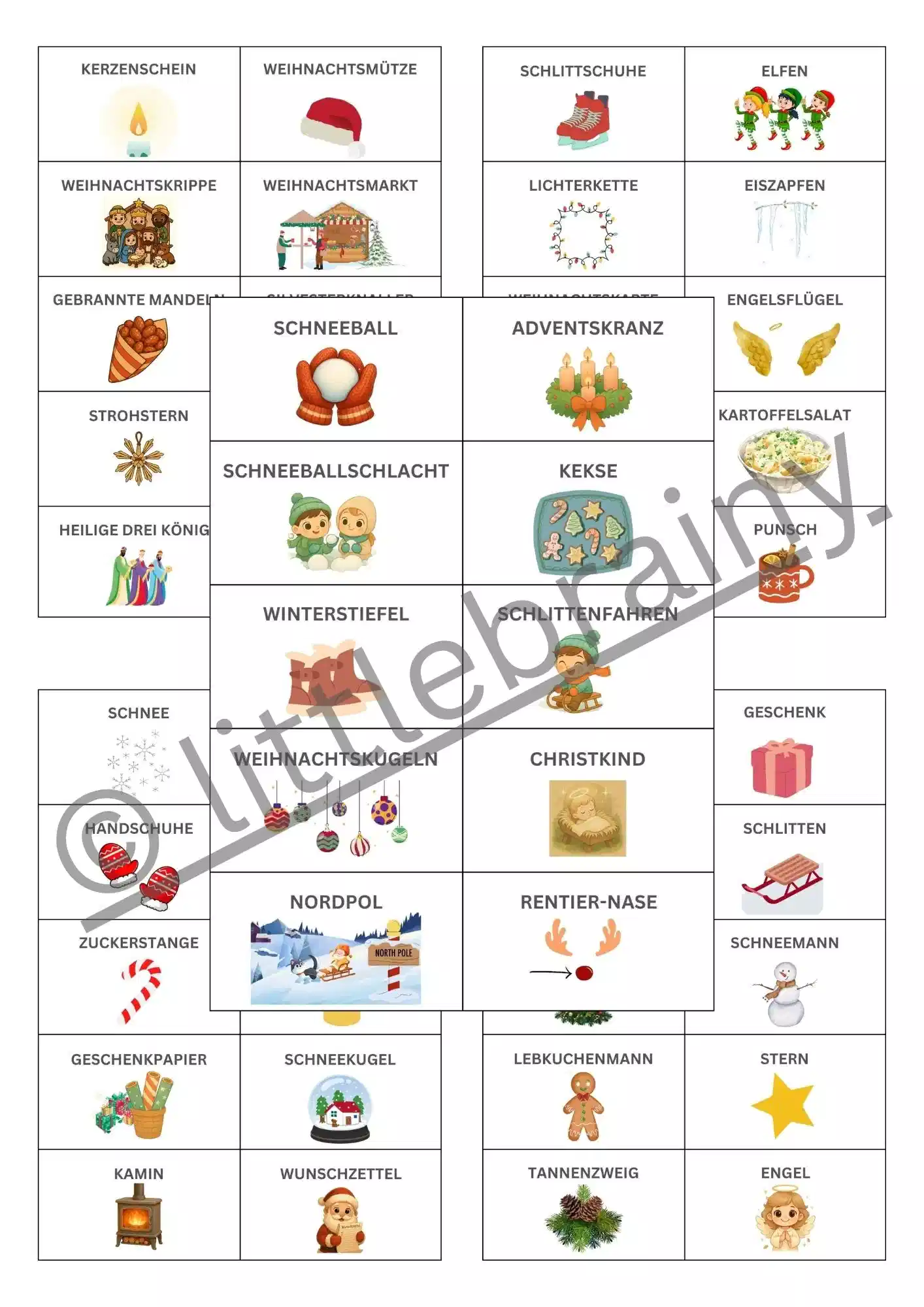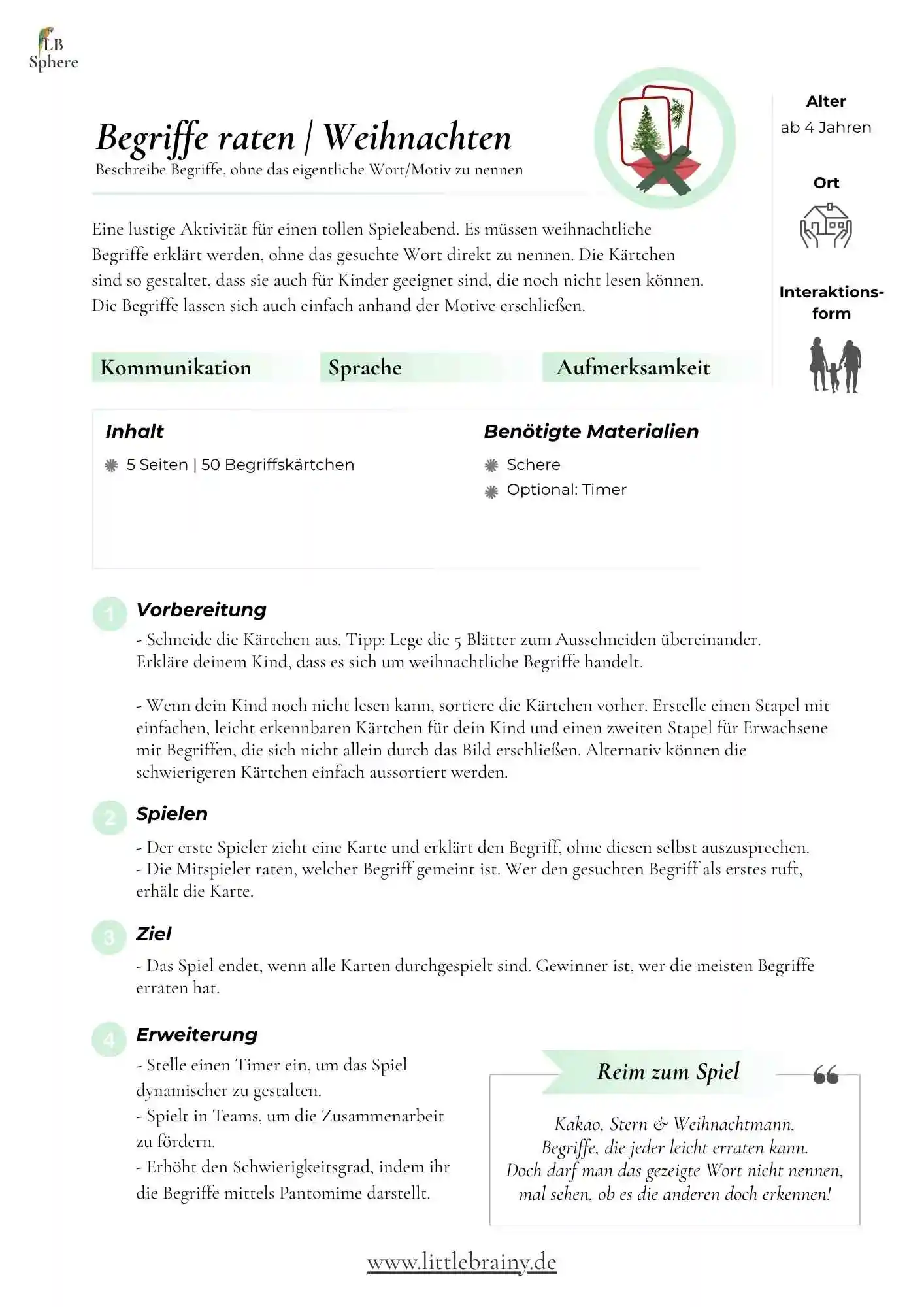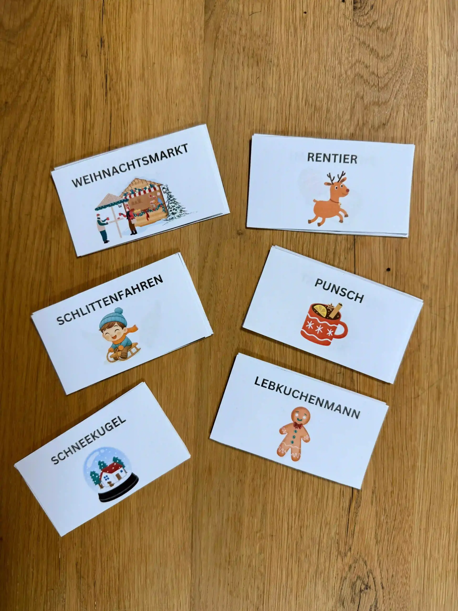 Du erhältst 5 PDF-Vorlagen mit insgesamt 50 Begriffskärtchen rund um Weihnachten, Winter, Advent, Bräuche und Leckereien. Leichte Begriffe mit Bildunterstützung ermöglichen auch Kindern, die noch nicht lesen können, aktiv teilzunehmen. Anspruchsvollere Begriffe bringen ältere Kinder, Jugendliche und Erwachsene ins kreative Erklären. Ganz nebenbei werden Sprachgefühl, Wortschatz, Ausdrucksfähigkeit und Aufmerksamkeit gefördert. Ohne Druck, aber mit unheimlich viel Spaß!