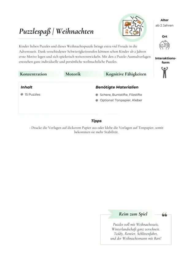 Dieses Weihnachtspuzzle bietet ruhige Kinderbeschäftigung für die Adventszeit. Dank verschiedener Schwierigkeitsstufen puzzeln schon Kleinkinder ab 2 Jahren mit. Zusätzlich gibt es 2 ausmalbare Weihnachtsmotive, die anschließend zu eigenen Puzzleteilen geschnitten werden. Perfekt zur selbstständigen Kinderbeschäftigung in der Weihnachtszeit, ohne viel Aufwand.