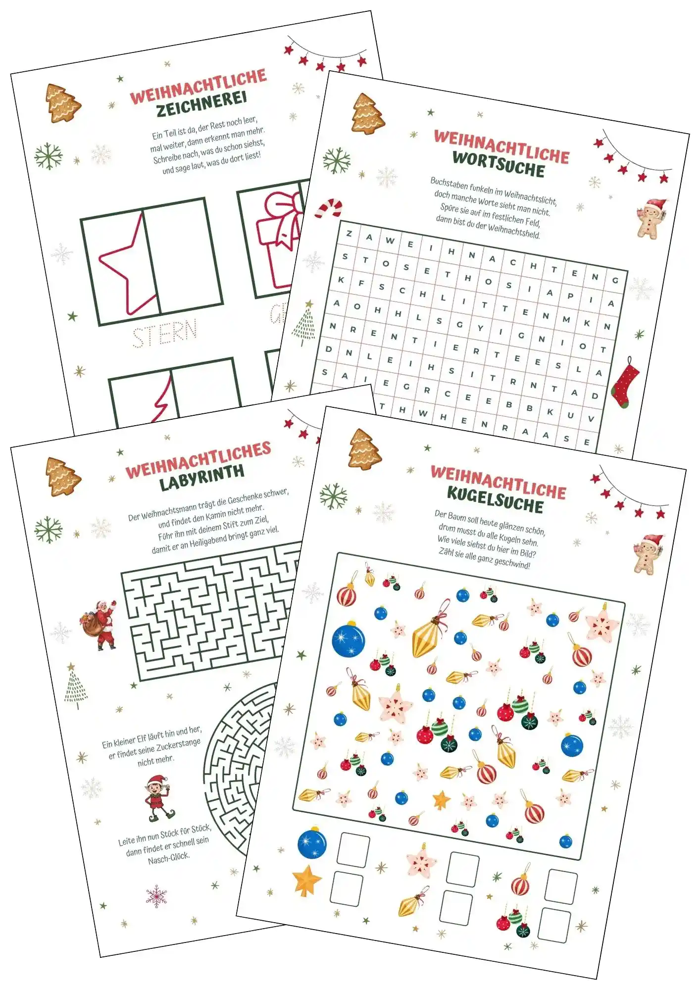 Diese Weihnachtsrätsel für Kinder enthalten zwölf abwechslungsreiche Rätselseiten rund um Weihnachten. Von Bilderfehlersuchen, Kugelsuchen, Labyrinthe, Wortsuchrätsel, Zahlenspiele, Buchstabensalat, Weihnacht Sudoku, Zeichenübungen sowie zwei kreative Ausmalbilder. Alle Rätsel sind kindgerecht gestaltet und ideal für die Weihnachtszeit.